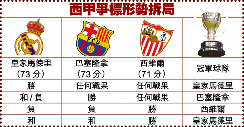 簡評:綜觀3強爭標形勢,以皇馬最為有利;他們只要在最後一周贏波,便毋須理會其餘兩隊的戰果而奪得冠軍。另外,由於皇馬在3隊中對賽成績最佳,如3隊最後同分,第1名將是皇馬,第2名為西維爾,第3名則為巴塞隆拿。