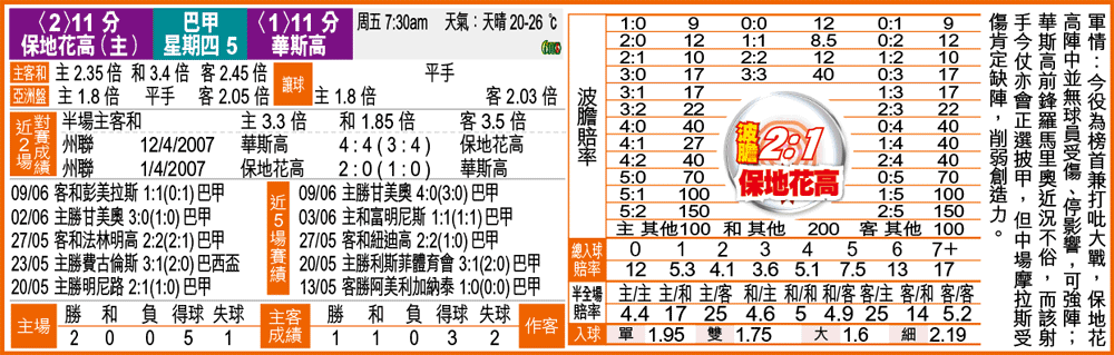 再者,華斯高是役有進攻中場摩拉斯因腿傷肯定缺陣,創造力難免削弱;而兩名守將祖斯洛廸古斯及山廸奧亦有傷在身,未知能否趕及上陣,故保地花高在軍容上是可見較他們完整。