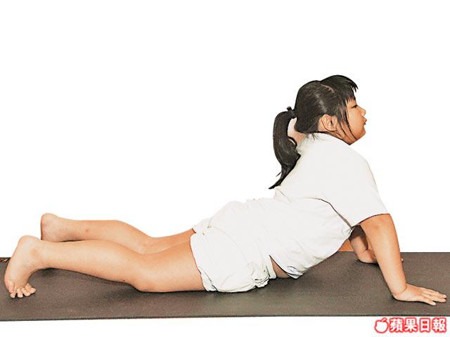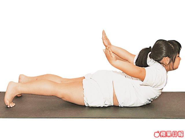 把整個身體趴在地,收緊臀部,雙腳微微離地平線,雙手往後伸展拉緊,持續拉向後至5下吸氣呼氣。