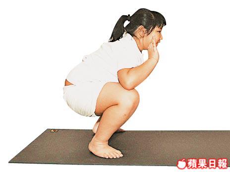 踎在地上,拉緊臀部肌肉,手掌攤開放在耳邊,穩定位置便往上跳,可跳5至10下。