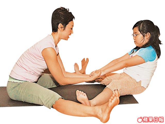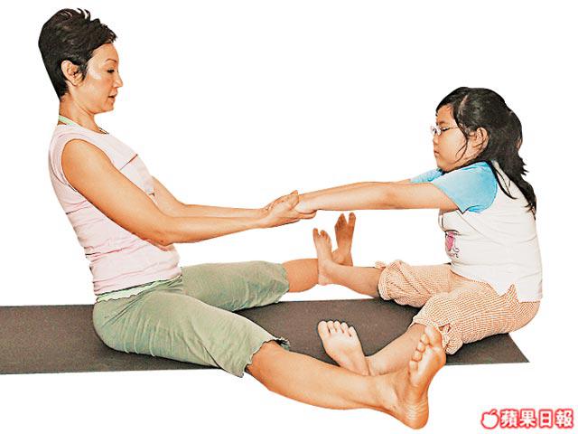坐在地上,攤開雙腳撐住對方,形成兩個三角形,雙手彼此緊握,盡量拉直子女雙手。