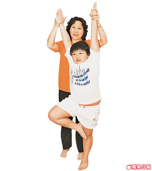 媽媽站在子女後方,子女單腳企並舉高雙手,媽媽就在後面幫助仔女企穩,待5下吸氣呼氣。