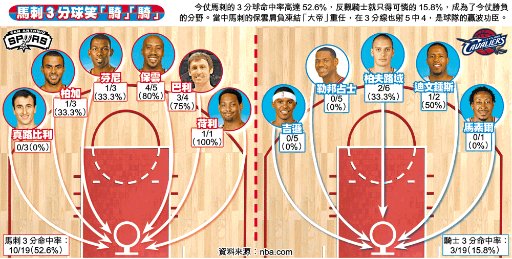 19投3中!這是克利夫蘭騎士在球會史上首場主場總決賽的3分命中率,包括勒邦占士在完場前、被保雲拉扯下投失的最後一射。只要騎士多入一球3分,他們在周二的總決賽第3戰或不致以72:75飲恨,墮入落後0:3的萬劫不復深淵。如今馬刺只要再勝一場,即可5年內3度稱王。