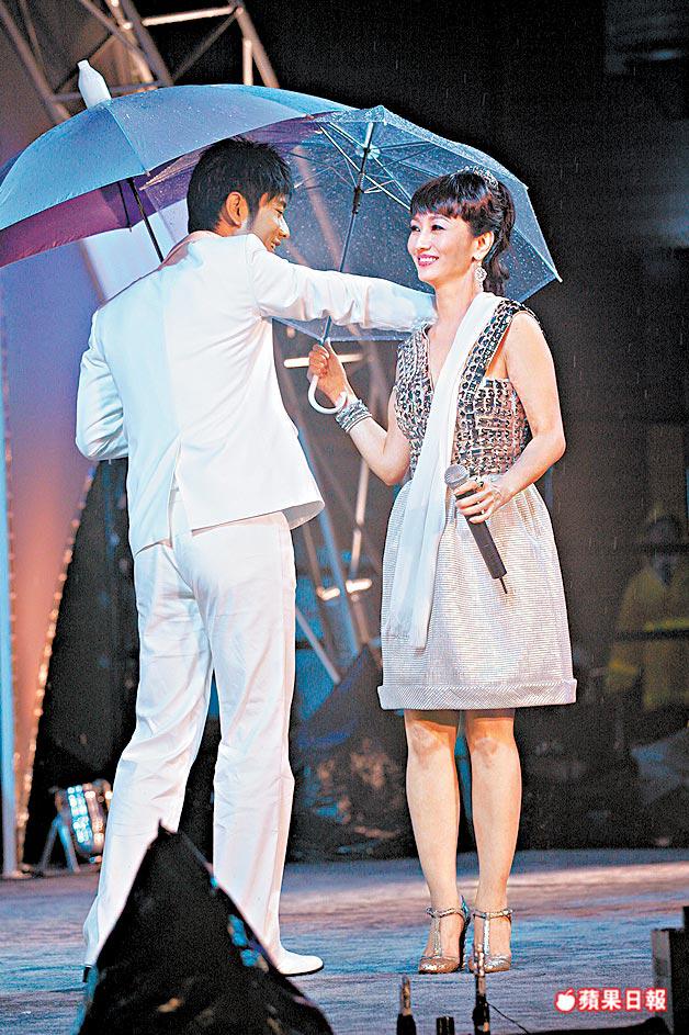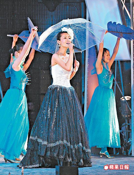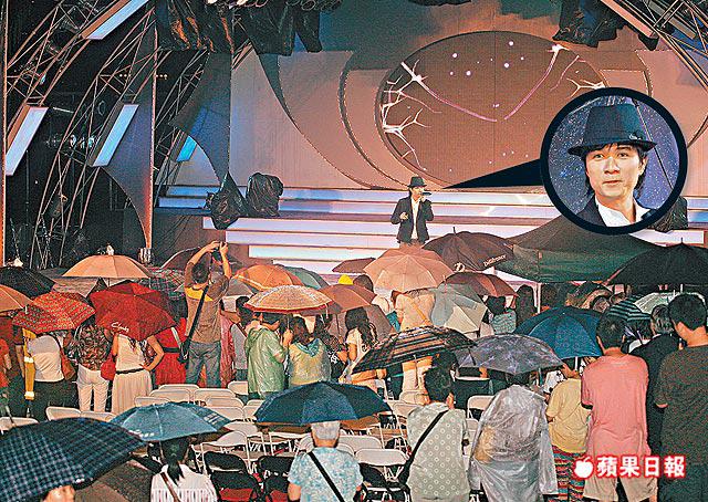 梁詠琪早前於內地演出時,在台上跌得四腳朝天,前晚她吸取了教訓,撐着透明雨傘在佈滿積水的台上企定定獻唱,兩條腿幾乎動也不敢動;向以勁歌熱舞聞名的草蜢,跳舞時也減慢了速度。