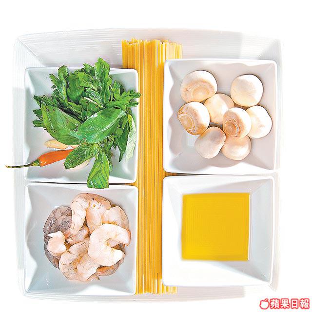 材料:扁意粉300克、細蒜頭2粒(切片)、辣椒1隻(切絲)、羅勒葉4片、蝦10隻、蘑菇6粒、橄欖油3茶匙、鹽/胡椒粉/水各適量