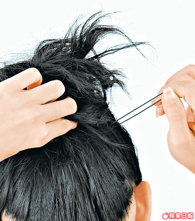 3.髮髻完成後留下的髮尾,用來玩層次,把大部份髮尾完全撥至頭頂,然後左中右分開小段頭髮。