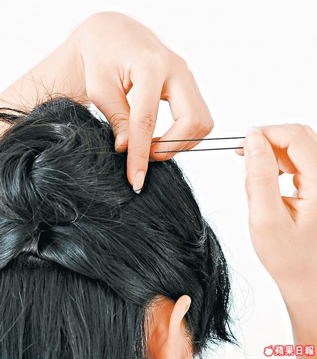 1.先把額前頭髮向後梳,用hairspray定型,大約用頭頂1/3頭髮,連同額前頭髮束好,把髮尾向左邊扭,以同一方扭兩次,結成小髻。