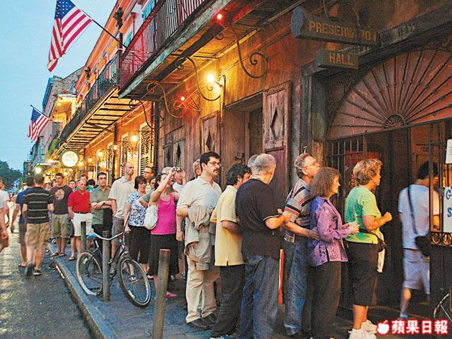 來新奧爾良聽爵士樂首推由Allan和SandraJaffe夫婦於1961年創辦的PreservationHall,樂手代代交替,風格不變,是最原汁原味的爵士樂。每晚3場表演,離晚上8時開騷前還有2小時,門口已大排長龍!表演場地只得600平方呎左右,設備簡陋殘舊,沒豪華音響沒飲品,座位也只得30個,卻擠進100人。我本在人群之後,裝儍扮懵左穿右插攝到前方去,蹲在地上準備一奏樂即影相。