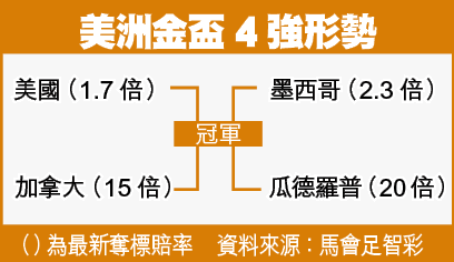 另一邊廂曾4奪美洲金盃冠軍的墨西哥,晉級過程仍欠說服力,該隊在8強於法定時間內僅賽和哥斯達黎加0:0,1.5倍熱W再一次泡湯。墨西哥最後憑老將射手波格廸加時頭槌建功,小勝對手1:0殺入4強。墨西哥4強將遇上淘汰洪都拉斯的瓜德羅普,屆時應有效力巴塞隆拿的守將馬基斯趕及歸隊,而賽後墨西哥的奪標賠率為次熱的2.3倍。至於另一場4強賽事,則由東道主美國對加拿大,前者1.7倍冠軍賠率為4隊中最熱。
