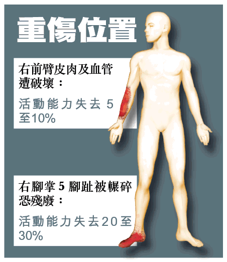 屯門醫院急症室醫生馮顯達表示,以傷者傷勢保守估計,手部活動能力受損至少5至10%,腳趾對腳部發力及保持身體平衡至為重要,腳部活動能力受損至少20至30%,相信日後恐難再參與爆炸力及靈活性極高泰拳活動。
