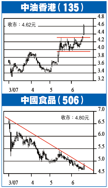 講開紅籌股,原稱中糧國際嘅中國食品(506)自分拆中糧控股(606)後幾乎只跌不升,以除淨後合理價6.2元計,去到噚日收市4.8元已跌去22%,同期紅籌國企各有各升,而且同期國內食品價格漲價,照計無理由股價跌得咁緊要,估計為收取中糧控股派送嘅基金,都應沽得七七八八,現位買有相當高嘅值博率。