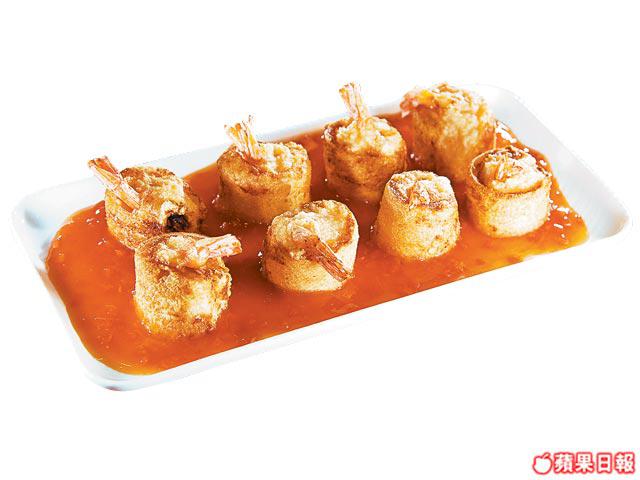 做法:其中8隻生中蝦去殼開背,洗淨加1/3茶匙鹽調味。其他蝦去殼去腸拍成茸,加1/3茶匙鹽和1茶匙生粉,順時針攪後塗在麵包上。木瓜切兩條粗條,加上生蝦放在麵包一端捲好;放入滾油炸8分鐘至脆,切件放上碟。其他木瓜肉切成茸,加入清湯、茄汁和糖煮滾後,加生粉水埋芡,淋上蝦卷便成。