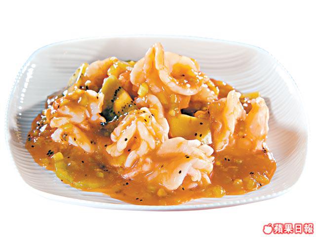 材料:大蝦球10隻(去殼開背)、奇異果2隻(1個切片、1個切碎)、蛋白1隻、鹽2/3茶匙、生粉1茶匙、清雞湯1/2碗、茄汁2湯匙、油少許