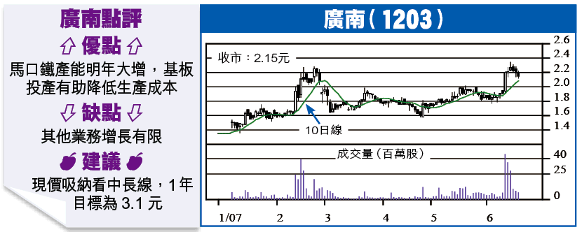廣南昨收2.15元,預期今年PE15倍,明年將降至10倍或以下,而後年續有理想增長,中長線看好。