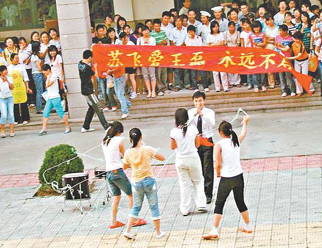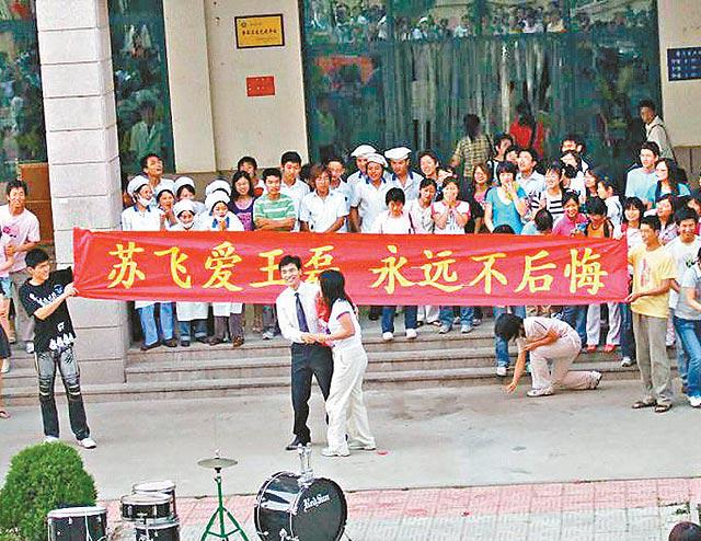 「蘇飛愛王磊,永遠不後悔﹗」內地互聯網近日流傳一輯聲稱是「青島理工大學史上最牛(巴閉)的求愛」相片。該校一名男生在友人的協助下,以送花、展示大型愛心banner、樂隊助興等方式,向心儀女生示愛,引來數百名同學圍觀。由於當中向圍觀者拋「喜糖」的環節一度引起混亂,結果保安哥哥也來「湊熱鬧」,同學們最終無奈地散去。