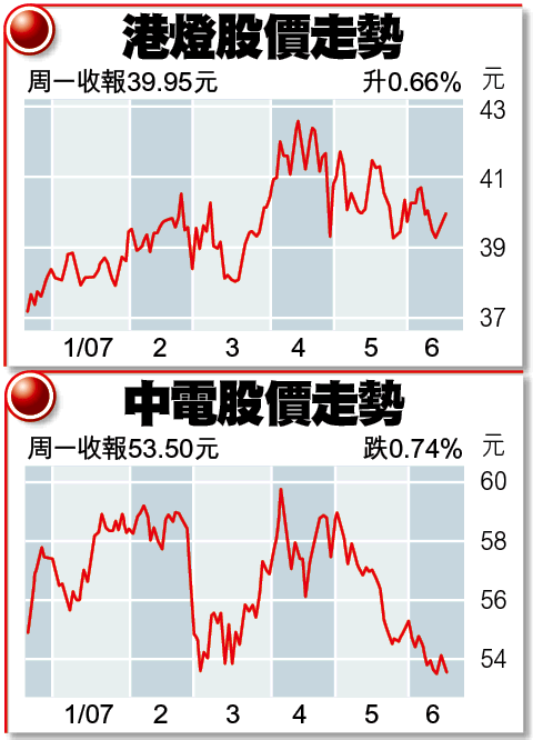 摩通給予中電「中性」評級,目標價53元;港燈評級為「減持」,目標價37.5元。瑞信證券較樂觀,給予中電「跑贏大市」評級,目標價69.5元;港燈為「中性」,目標價41.2元。中電本周一收報53.5元,跌0.74%;港燈收報39.95元,升0.63%。