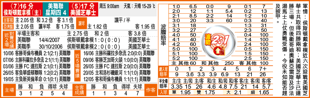 美職聯在周四上演「獨腳戲」,由衞冕冠軍的侯斯頓戴拿模迎戰美國芝華士;由於前者近況轉好,中前場球員尼雲耶又腳風甚順,少讓平/半,取上盤。