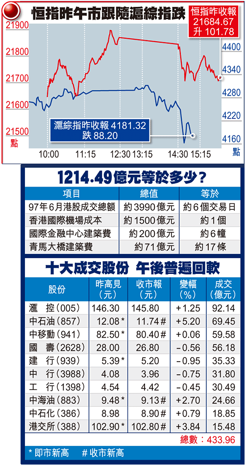 恒指昨一度逼近21900,升314點,中移動最多彈高逾2元,建行(939)亦衝上歷史新高5.39元,可惜午後在獲利盤湧現兼內地A股倒跌下,大市僅升101.78(0.47%),收報21684.67。H指曾突破12000關口,惟六行三保普遍虎頭蛇尾,收市只升24.36(0.21%),報11905.48,惟仍與恒指雙雙創新高。