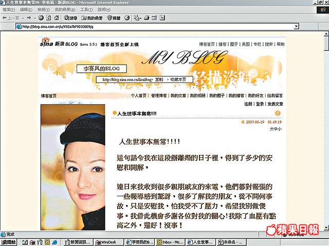 此外,宗天意有飲歌《愛情戰場》,歌詞中有指「勇敢面對決不投降」,李賽鳳昨日也在blog上加上背景音樂和應,那是內地女歌手弦子的歌曲《醉清風》,其中歌詞有幾句「和你醉後纏綿 你曾記得 亂了分寸的心動」、「曲終人散誰無過錯我看破」等等,莫非李賽鳳對近日發生的事有感而發?