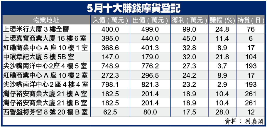 上述摩售登記,絕大部份獲利,賺幅最高是西營盤梅芳街5號20樓B室,達28%,炒家持貨僅12日。另上環米行大廈3樓賺99萬,為所賺金額最高。炒家平均持貨日數,由4月份的96.3日,減至上月72.7日,反映市場承接力加強。