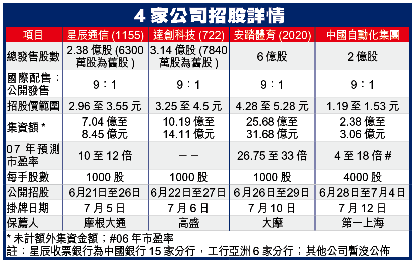 入場費較高,按每手4000股計達6187.26港元的內地石化和鐵路行業安全控制設備供應商中國自動化集團,則擬發行2億股新股,6月28日至7月4日招股,7月12日掛牌。招股價1.19至1.53港元,集資2.38億至3.06億港元。保薦人為第一上海(227)。