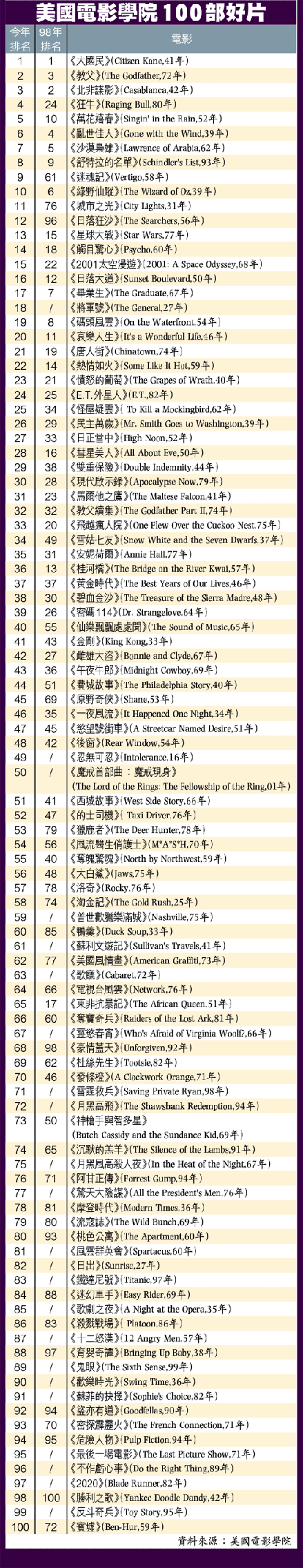 其實在新排行榜上,頭三甲的影片完全沒有改變,今次排行第2的《教父》及第3的《北非諜影》,在98年只是對調位置。至於《亂世佳人》及《綠野仙蹤》等經典則仍然留守在10大之中。至於1996年後所製作的電影,只有4齣入選,分別是第50位的《魔戒首部曲:魔戒現身》、排第71的《雷霆救兵》、排第83的《鐵達尼號》及排第89的《鬼眼》。