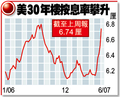 【本報綜合報道】全美第二大樓按機構FreddieMac表示,美國30年期定息按揭息率已由5月上旬的平均6.15厘升至上周的6.74厘,累積升幅達0.59厘;浮息按揭息率上周亦攀上6.75厘,較04年高四成。