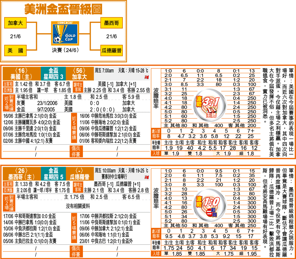 加拿大從來都被美國「食住」,單以近6次對賽計算,加拿大2和4負,共失12球而入球數為0!從加拿大8強以3:0大勝危地馬拉的戰果看,似乎銳氣正盛,但加拿大由分組賽至今整個晉級過程中,根本未遇強敵,其看似穩固的防線,未必可抵禦「周身刀張張利」的美軍。