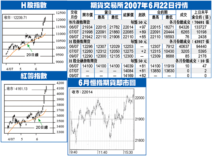 市場由資金主導,亞洲區股市反覆,但未有拖累港股,周末前現貨市場成交活躍。期指下周四結算,在半年結及回歸10周年的因素下,料保持在高位波動,美息亦成短期的焦點。技術而言,期指昨日貼近高位收市,短線指標再向上,淡友防線已失,料下周初仍有止蝕盤出現,但升幅應會收窄,高位套利活動亦可能增加,會在500點之內波動。