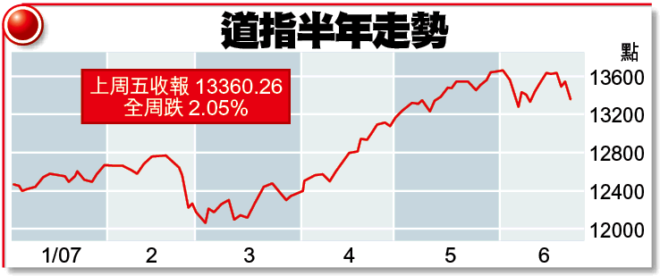 【本報綜合報道】道指上周五跌185點或1.4%,收報13360點;納斯達克綜合指數挫28點或1.1%,收報2588點;標準普爾500指數則跌19點或1.3%,收報1502點。