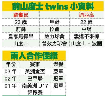 03年,羅賓奴與廸亞高才剛成名,前者理財不善與家人鬧翻,後者則誇口自稱「性鬥士」,而羅賓奴更曾在巴西奧運隊拍照時脫去廸亞高褲子,真箇成何體統!誰想到事隔4年,這對當年少不更事的前山度士twins,將會在今屆美洲國家盃擔任主力,撐起巴西。文:法比奧、藍鑽石