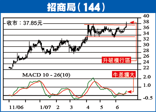招商局今年初至4月在27-33元水平形成長方形橫行區,4月初以裂口大陽燭急升後,徘徊區上移一級,近3個月股價在33元至37.8形成另一個長方形區。上周五招商局以大陽燭升穿37.85元,MACD牛差擴大,保歷加通道亦向上下撐開。根據其「慣性」走勢,破頂後相信會層層而上,營造上一級橫行區。