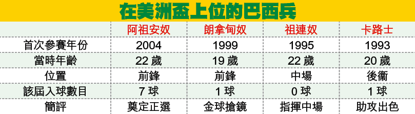 多名巴西球星,包括「細哨」朗拿甸奴曾在美洲國家盃踢出名堂,繼而奠定在國家隊的地位,故這賽事堪稱巴西兵的「上位」階梯。廸亞高在國家隊的前途,還看今屆表現。