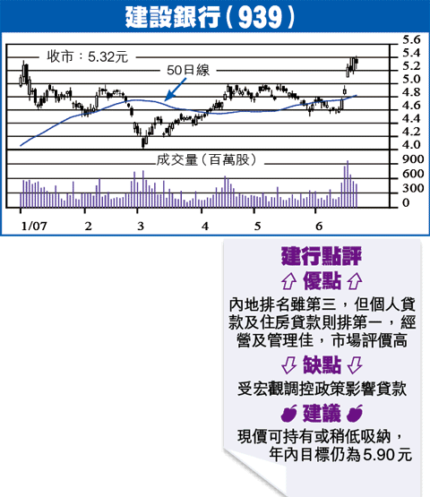 筆者於4月中旬評論建行業績,當時股價4.71元,認為揸中線勝短炒,直至公佈發行A股前,仍無短炒機會,上周升至5.32元,是機緣巧合,筆者預期年內目標為5.90元,無意修正,如有差異,相信不會太大,可能只是股息影響或係A股上市後的推動而已。