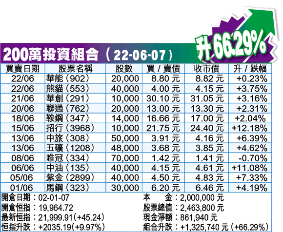 華能(902)已買入,9元關阻力頗大,未能一舉衝破屬意料中事,相信整固後可破關,破關會酌量加注。熊貓(553)亦已入貨,股價升破頸線,向好,計數位推上4元。中旅(308)終於起動,周線圖MACD將重現雙牛,利好,目標仍看5元,計數位上移至3.9元。