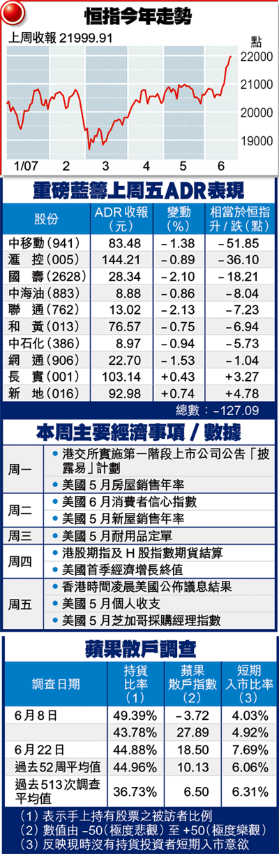 蘋果散戶調查亦顯示,散戶看好後市人數比例回落,由6月15日的27.89降至上周的18.50﹔持貨比率輕微上升,短期入市意欲亦微升2.77個百分點,反映港股經過上周強勁升勢後,投資者相信短期升勢將放緩,但仍對後市抱審慎樂觀態度。