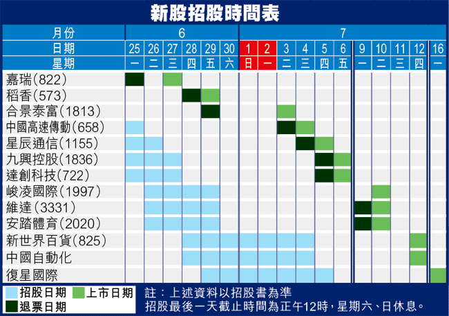 至於由新世界發展分拆上市的新百貨,則於今日進行路演,率先在周四招股,7月12日上市。而有美國NBA籃球隊休斯頓火箭班主LeslieLeeAlexander入股的內地著名運動品牌安踏體育(2020)、維達(3331)及峻凌國際則於明日(周二)開始招股。