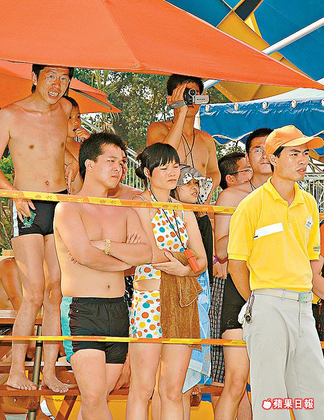 港姐大隊昨早從肇慶轉往番禺續拍外景,戲肉落在下午假長隆水上樂園拍攝的泳衣宣傳片上,16位佳麗齊齊穿上性感三點式泳裝戲水,如此養眼的靚女濕身場面,卻明益入場泳客,事關大會雖然在取景的人造波浪池劃出拍攝範圍,但無遮無擋,花費140元人民幣買入場票的泳客可任昅任睇,玩足一日,港姐泳裝拍攝由下午3時至傍晚7時結束,引來逾200名泳客圍在池邊睇足四小時。