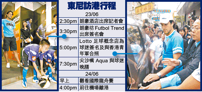 昨日在旺角一帶掀起一遍「東尼潮」,他每到之處都吸引數百男女球迷圍觀。首站先到朗豪酒店與傳媒會面,雖然東尼比預定的時間遲了半小時,但迷人的笑容及友善的態度,還有在傳媒面前表現多次搖手慶祝入波方式,引來全場大笑。他說:「其實這手勢沒有太大意義,只是我們意大利人慣做的而已。」
