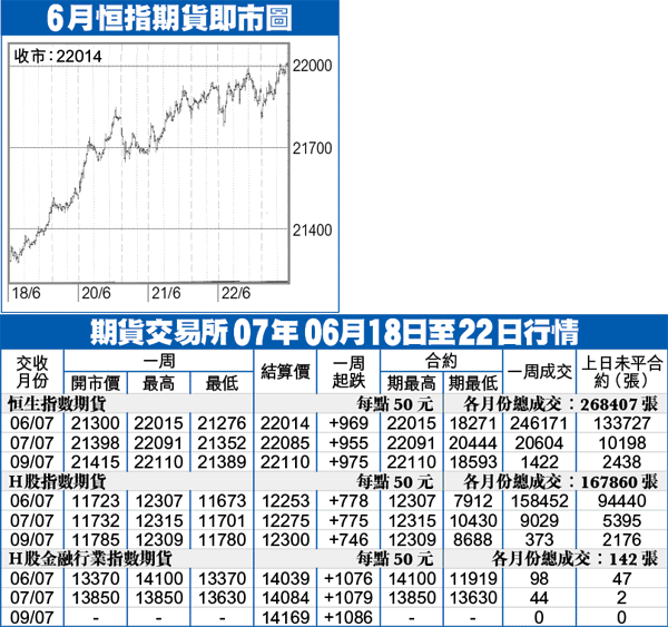 中央放寬QDII政策,資金持續流入,刺激現貨成交額突破千億元,加上回歸10周年進入倒數,以及半年結基金櫥窗粉飾,大市順勢挾高。