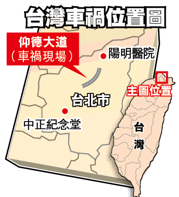 一場慶祝活動,竟換來死神的召喚!台北市著名旅遊勝地陽明山,昨日傍晚發生嚴重車禍。一輛旅遊巴下山時,疑擦撞前方車輛後,失控衝落50米山谷,乘客連同司機全被壓在車內動彈不得,救援人員趕到現場,只見旅遊巴扭成一大團廢鐵,部份乘客被拋到車外,東倒西歪地躺在草叢裏,救援人員心有餘悸地說:「那種景象只能用哀鴻遍野來形容。」這場車禍造成至少8死24傷,另有4人失蹤。