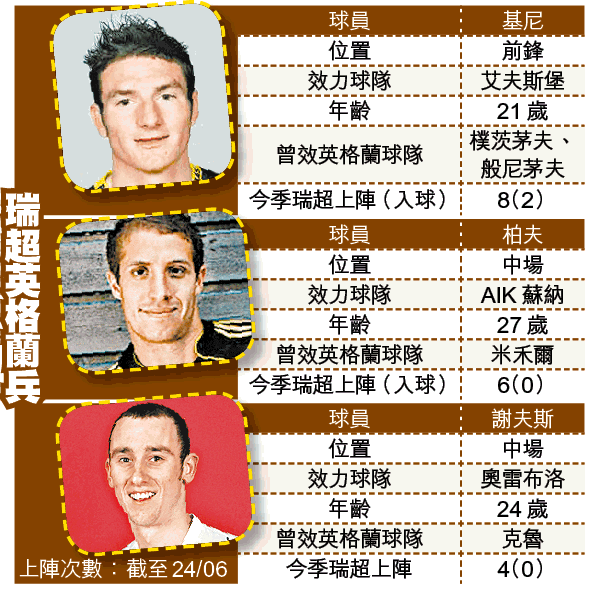基尼今季在艾夫斯堡有穩定演出,聯賽上陣8場,更連續兩仗有入球;不過其餘兩位英格蘭人卻稍為失色,曾效力米禾爾的中場柏夫,雖然上季已加盟AIK蘇納,但仍是替補角色;而謝夫斯更要在奧雷布洛爭取上陣機會。