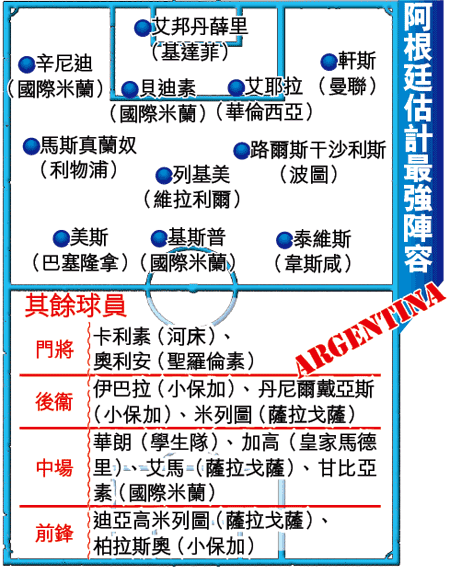 阿根廷現呈人滿之患,巴斯利美其名召用多名在國內球會效力的戰將,但除華朗有一絲機會爭取正選外,其餘皆屬副選。阿根廷可排4-3-3,前線排出美斯、泰維斯、基斯普三「斯」會審攻堅,但亦可能轉為4-4-2,騰一個空位加強中場,屆時甘比亞素將大派用場。薩拉戈薩三寶,即米列圖兄弟及艾馬未必是正選,勝在質素高,任何時候上陣都可產生作用。