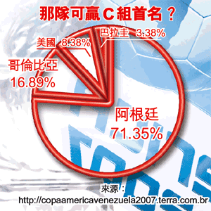 阿根廷置身於C組,對手包括世界盃常客巴拉圭、美國,以及經常當上異軍的01年盟主哥倫比亞。考慮到美國派出較角逐美洲金盃還要弱的陣容參賽,志在參與,隨時成「三零部隊」。阿根廷首戰的對手就是周四對美國,正好以之祭旗。