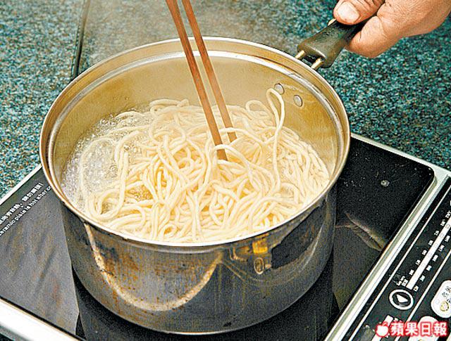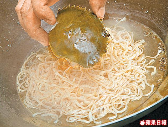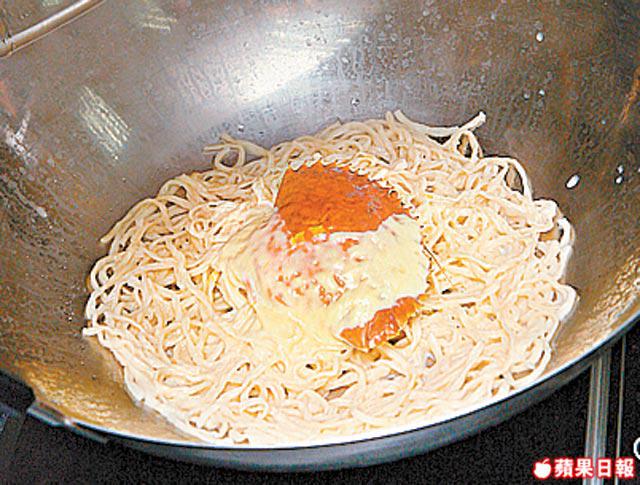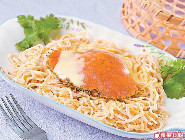 做法:先將伊麵以滾水烚腍,瀝亁備用;燒熱鑊,下少許油,放入伊麵/雞湯/蟹蓋,鋪上芝士,冚蓋焗大約4分鐘至收亁水即成。
