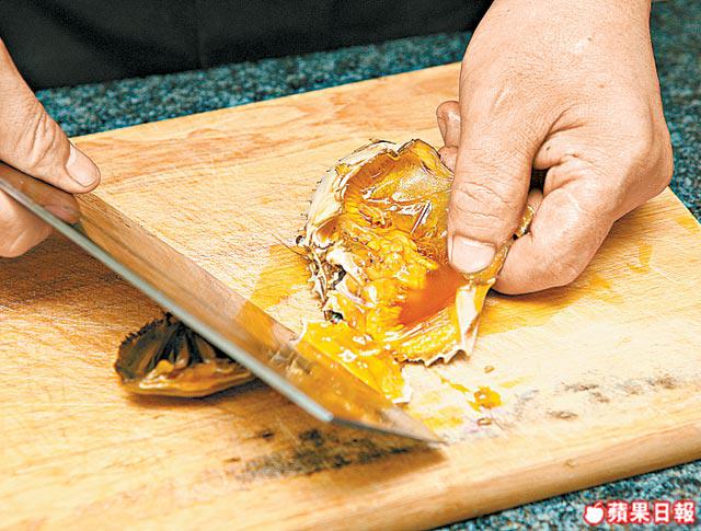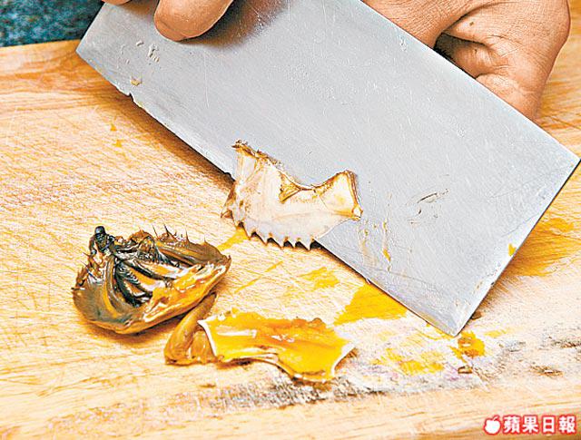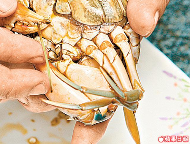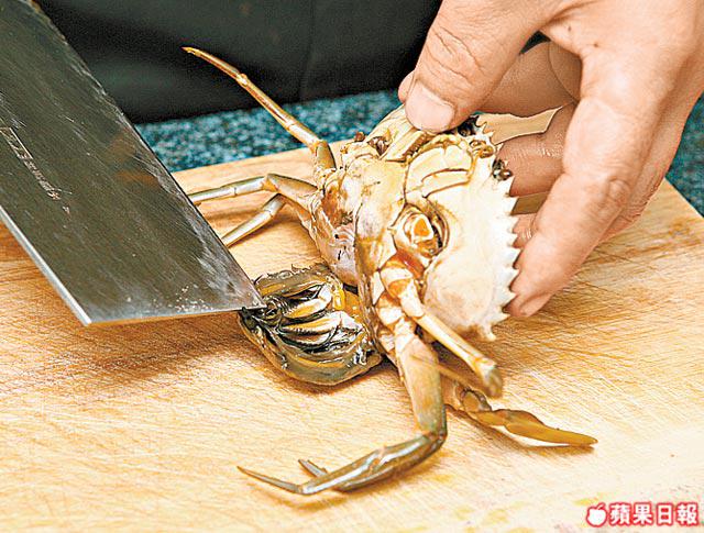 做法:先將蟹箝烚熟,放雪櫃冷凍備用;蒜頭切碎粒,混入芥辣魚露,拌勻成醬料。蟹箝拆肉蘸醬料食用。