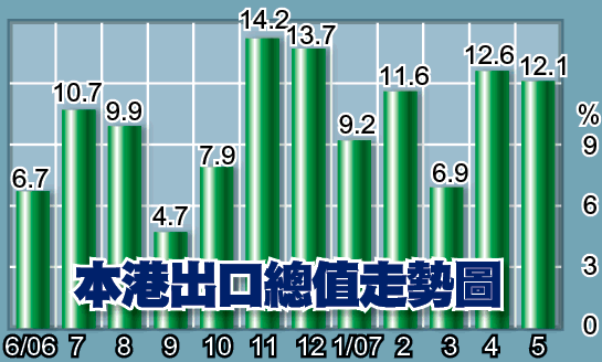 政府發言人指出,本港商品出口於5月份維持強勁,並錄得廣泛增長。內地市場繼續成為出口增長動力的同時,輸往東亞地區的出口亦顯著增長。隨着日本和歐盟經濟復蘇,出口至日歐市場亦見平穩增長,從而抵銷美國市場的偏軟。