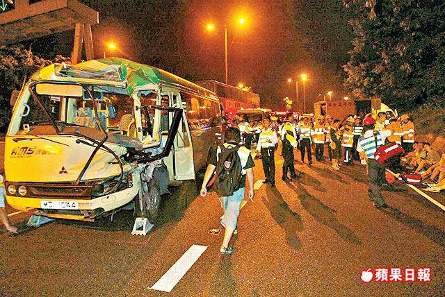 惟此際尾隨一輛滿客的綠色專線小巴沿中線馳至,司機目睹前方有車輛停下,收掣減速卻跣胎失控朝貨車車尾狂撼,他只好拚命扭右軚,左車頭猛撼貨車右尾角,貨車順勢向前推將私家車狂掃,最後導致3車共18名男女受傷。傷者中,13人屬小巴上的乘客,他們是滾落地上擦傷或扭傷腰頸等。