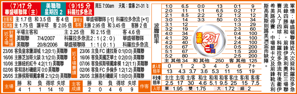 主客和:星期四2華盛頓聯隊勝(1.7)