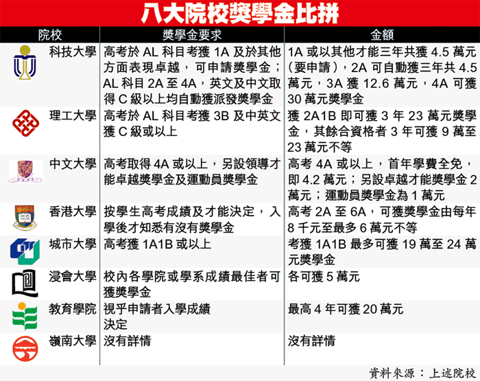 除科大外,各校均設有不同的獎學金吸生,其中以理大及城大的金額最可與科大媲美。理大表示,若高考獲2A1B,三年即可獲23萬元獎學金,若獲3B亦可獲9萬元獎學金。城大的「A+++獎學金計劃」則規定學生於高考獲2B或1A1B,每年最多可獲5萬元入學獎學金,另加1.8萬至4萬元交換生獎學金,若合資格的學生完成三年或四年制的學位課程,最多可獲19萬元至24萬元。